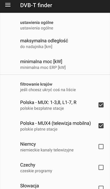 Dodatkowo można ustawić minimalną moc znajdywanych nadajników – dzięki tej opcji można np. usunąć z listy wyników nadajniki doświetlające, ponieważ z reguły mają bardzo małą moc. Można także z listy usuwać nadajniki z poszczególnych krajów a w przypadku Polski dodatkowo można ukrywać kanały z muxu 4tego – czyli Telewizję Mobilną od Cyfrowego Polsatu.